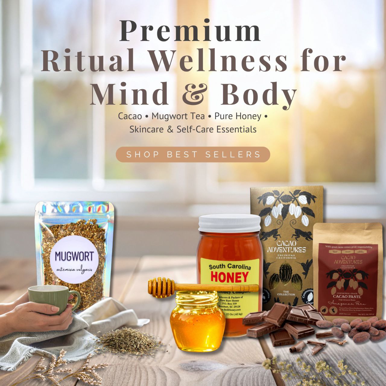 Enhance your mind, body, and beauty with pure honey, rich cacao bars, soothing turmeric honey soap, nourishing African shea butter, and herbal blends like mugwort and lucid dream tea created to support natural well-being.