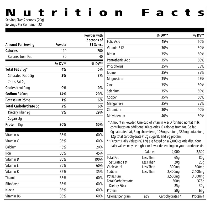 - Add 2 scoops (one serving) of Protein Drink Mix Select to Formula 1 Select Nutritional Shake Mix and blend or stir with 8 fl. oz. of water to boost your total protein intake to 25 g